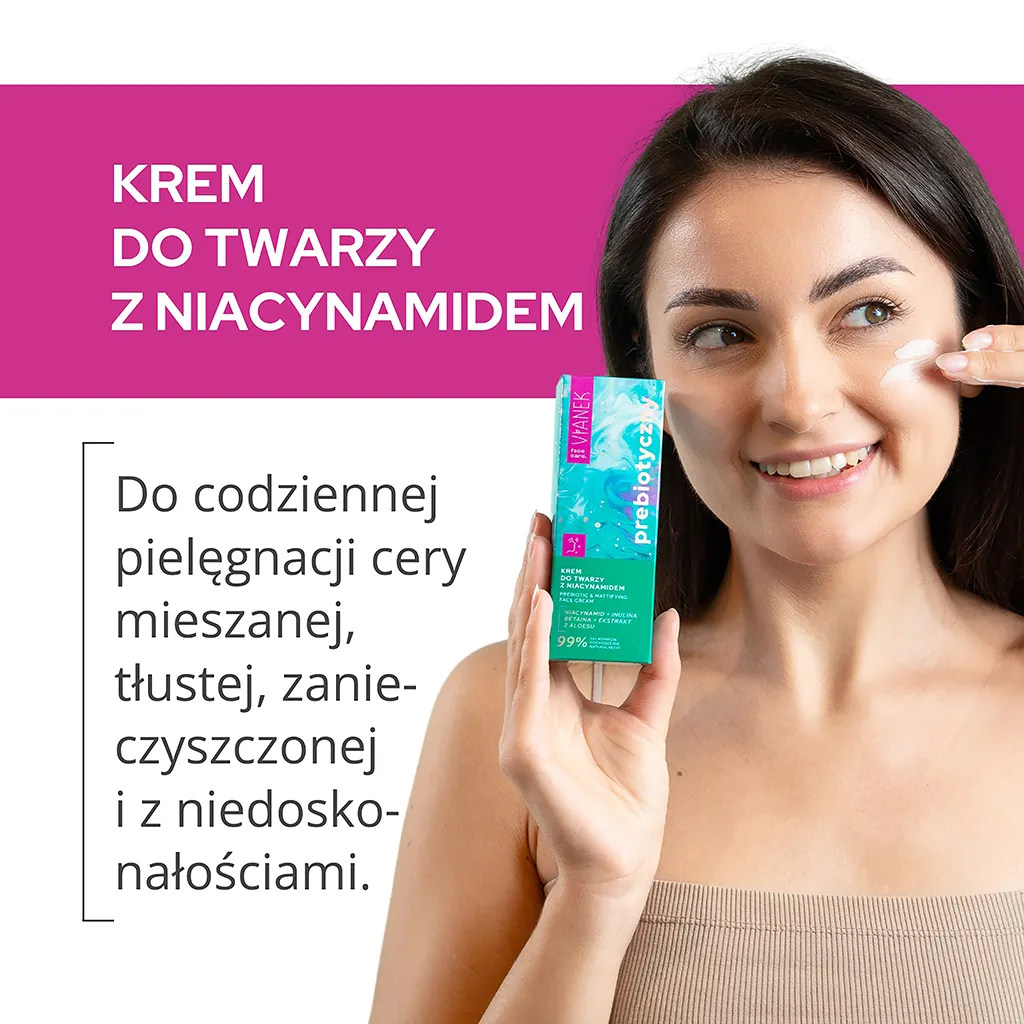 Prebiotyczny krem do twarzy z niacynamidem to doskonałe rozwiązanie dla osób o cerze mieszanej, tłustej i skłonnej do niedoskonałości. Krem działa wielotorowo, zapewniając intensywną pielęgnację, ochronę oraz poprawę kondycji skóry. Jeśli Twoja cera potrzebuje wsparcia w walce z zanieczyszczeniami i nierównym kolorytem, ten krem będzie idealnym uzupełnieniem Twojej codziennej pielęgnacji.