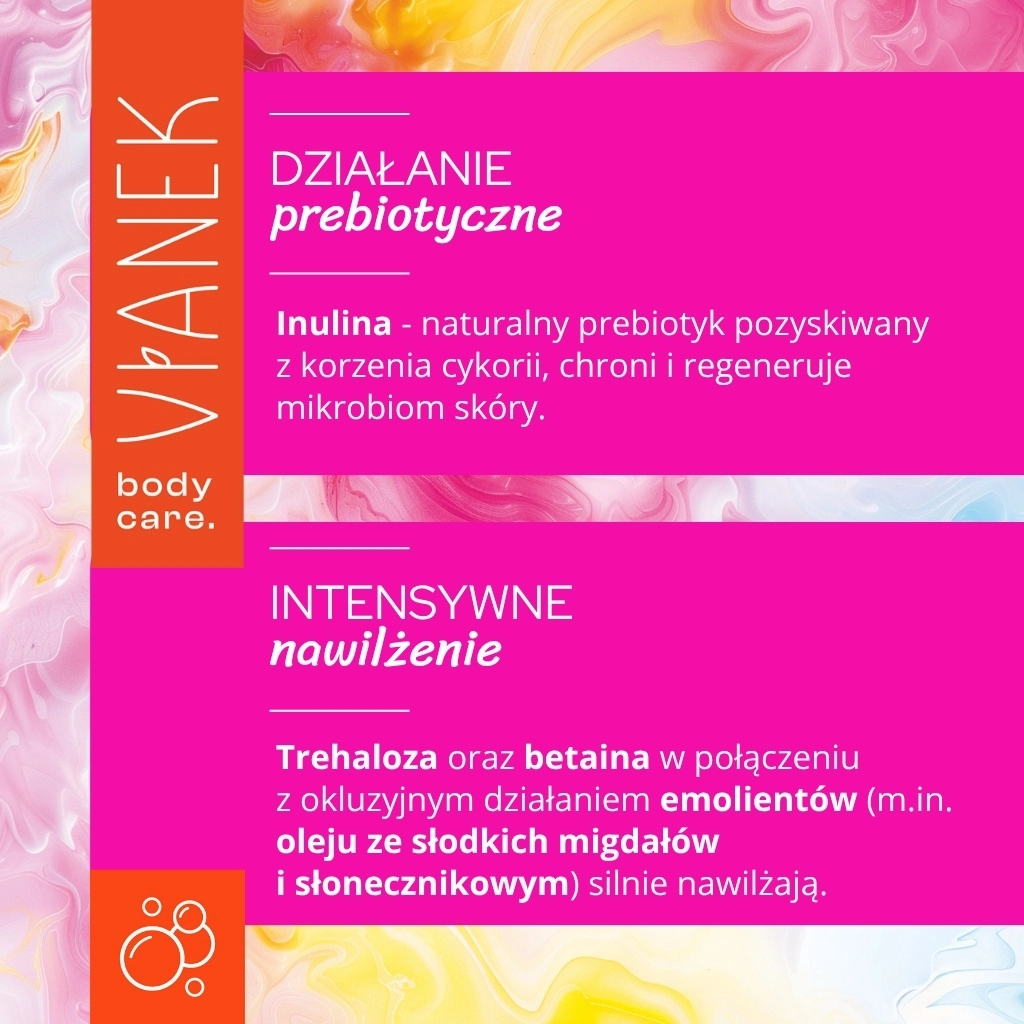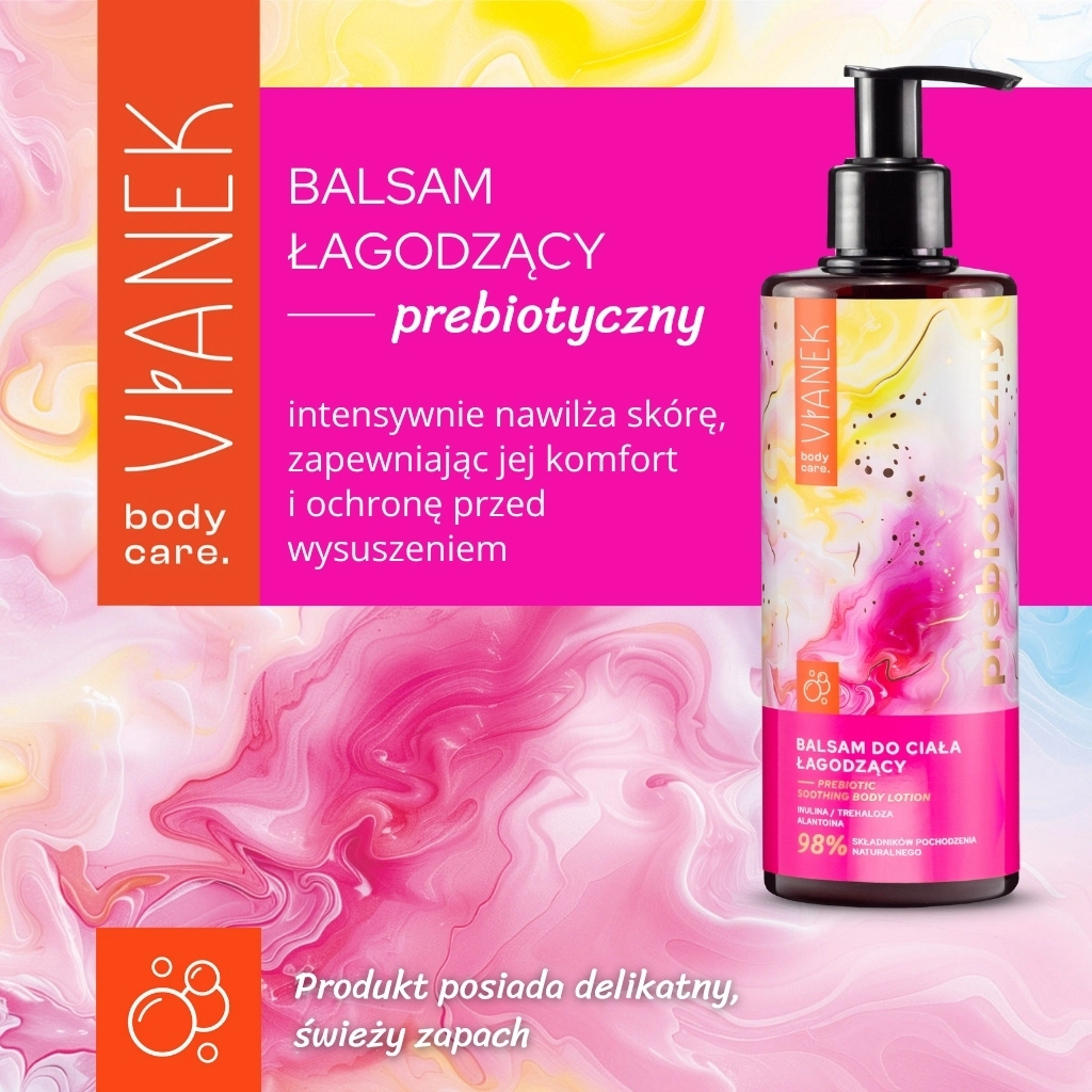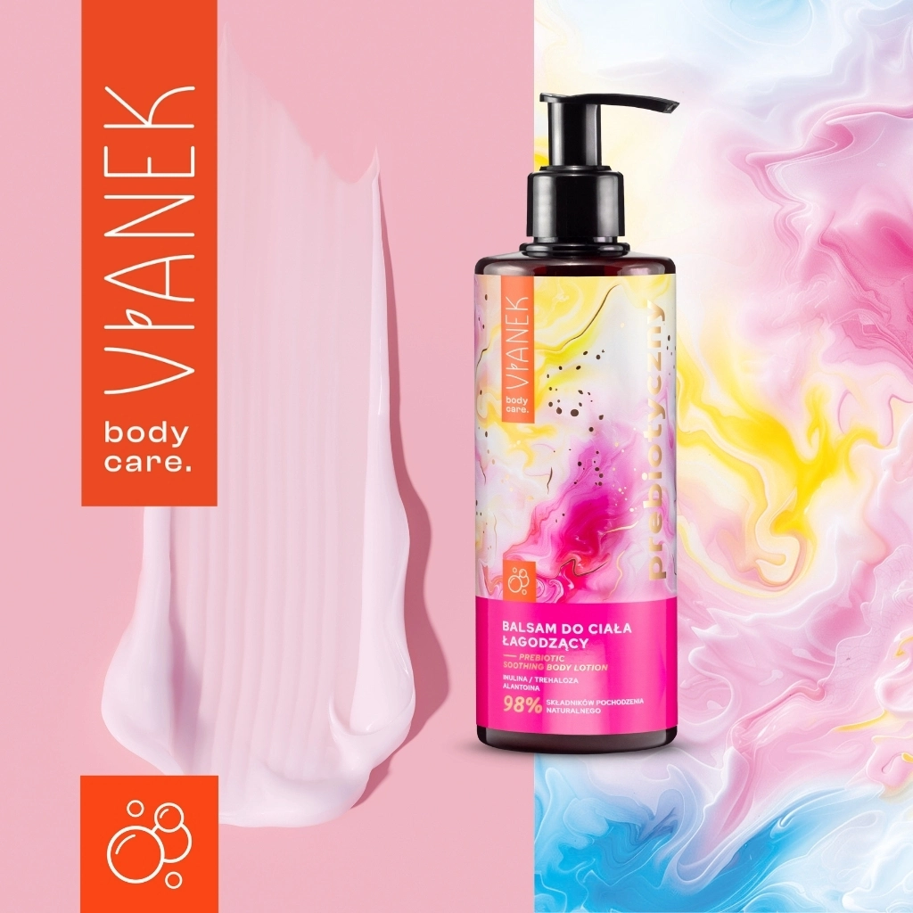 Dzięki zawartości inuliny – naturalnego prebiotyku pozyskiwanego z korzenia cykorii – balsam wspomaga odbudowę mikrobiomu skóry, wzmacniając jej odporność na czynniki zewnętrzne. Regularne stosowanie przyczynia się do poprawy kondycji skóry i przywrócenia jej naturalnej równowagi.