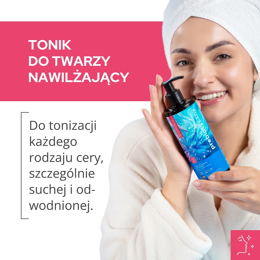 Prebiotyczny tonik do twarzy nawilżający to doskonały produkt do codziennej tonizacji każdego rodzaju cery, szczególnie suchej, odwodnionej i wrażliwej. Tonik przywraca skórze naturalną równowagę pH, przygotowując ją do dalszej pielęgnacji. Delikatna formuła sprawia, że jest idealnym wyborem dla skóry wymagającej dodatkowego wsparcia w nawilżeniu i regeneracji.