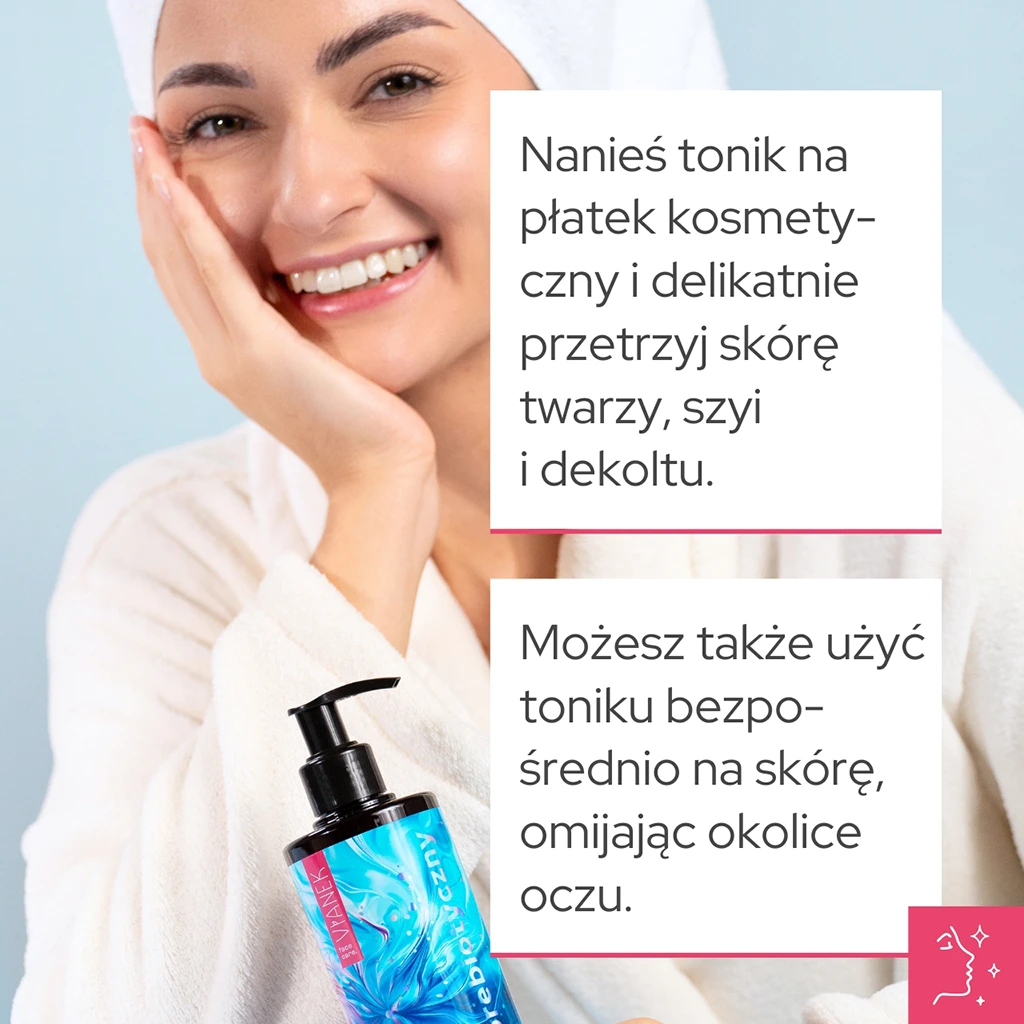 | Sposób użycia | Nanieś tonik na płatek kosmetyczny i delikatnie przetrzyj skórę twarzy, szyi i dekoltu. Możesz także użyć toniku bezpośrednio na skórę, omijając okolice oczu. |