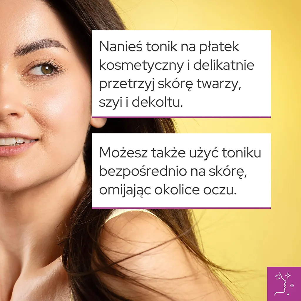| Sposób użycia | Nanieś tonik na płatek kosmetyczny i delikatnie przetrzyj skórę twarzy, szyi i dekoltu. Możesz także użyć toniku bezpośrednio na skórę, omijając okolice oczu. |