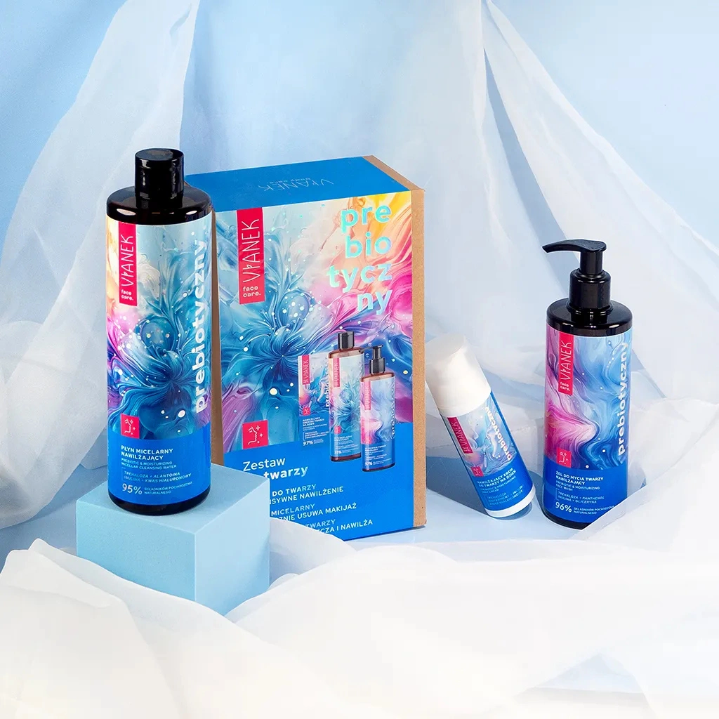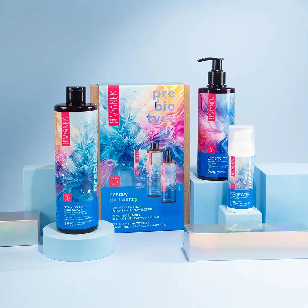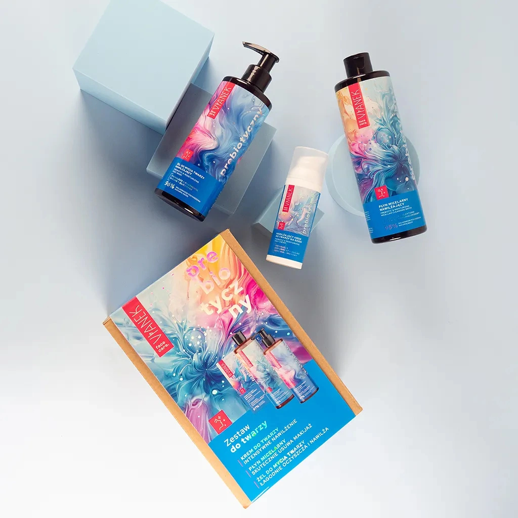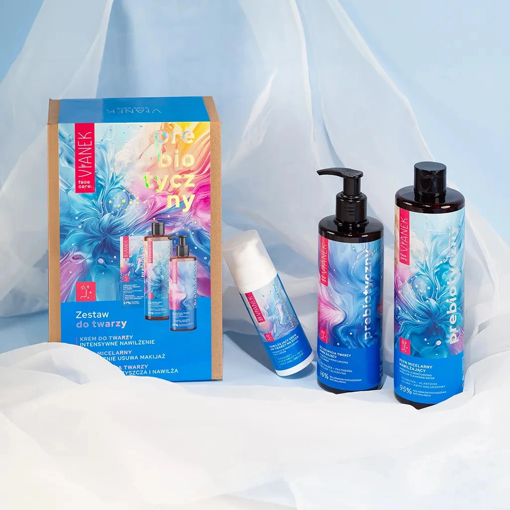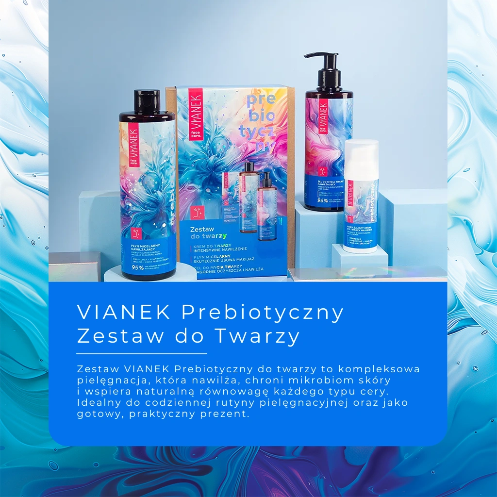 Zestaw VIANEK Prebiotyczny do twarzy to linia kosmetyków stworzona z myślą o każdym rodzaju cery. Produkty zawierają prebiotyki oraz starannie dobrane składniki aktywne, które wspierają naturalną barierę ochronną skóry, nawilżają ją i przywracają równowagę. Dzięki temu skóra staje się miękka, gładka i promienna, a codzienna pielęgnacja staje się prawdziwym rytuałem komfortu.
