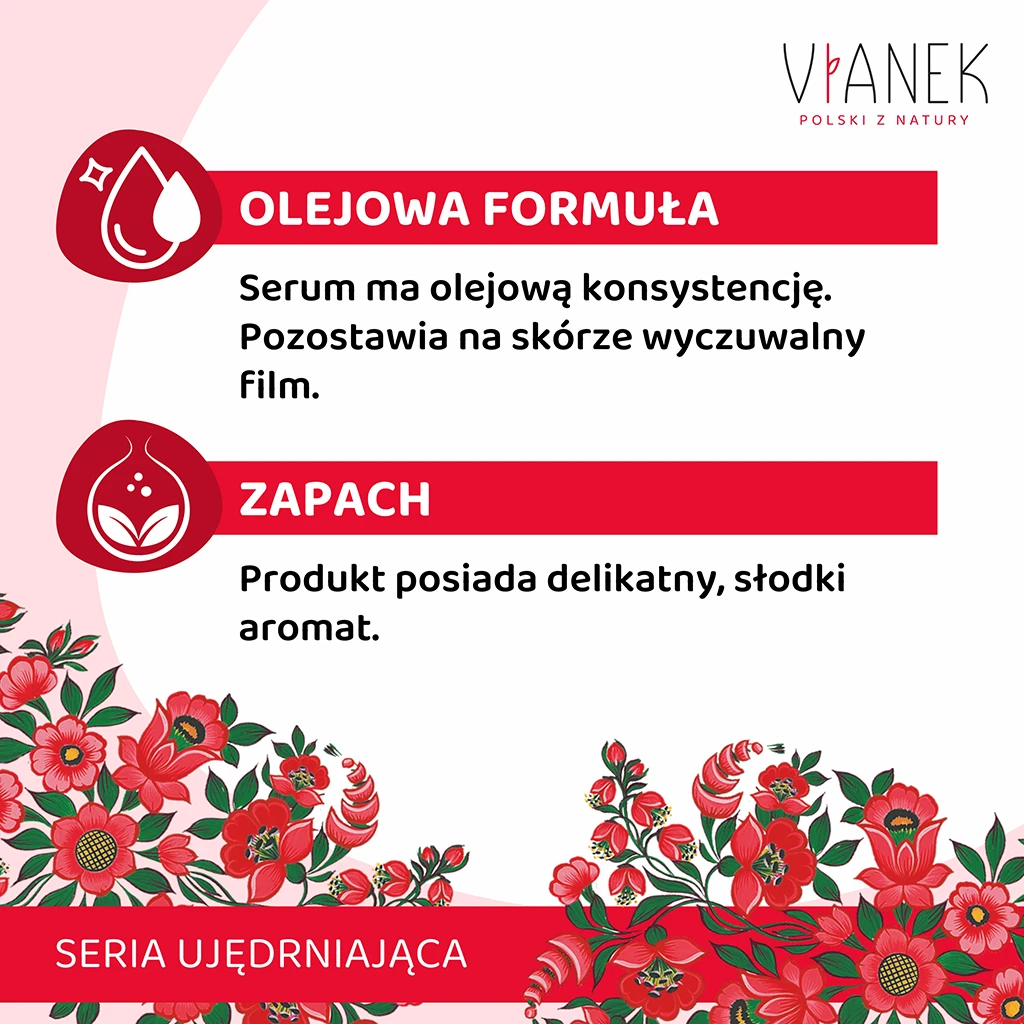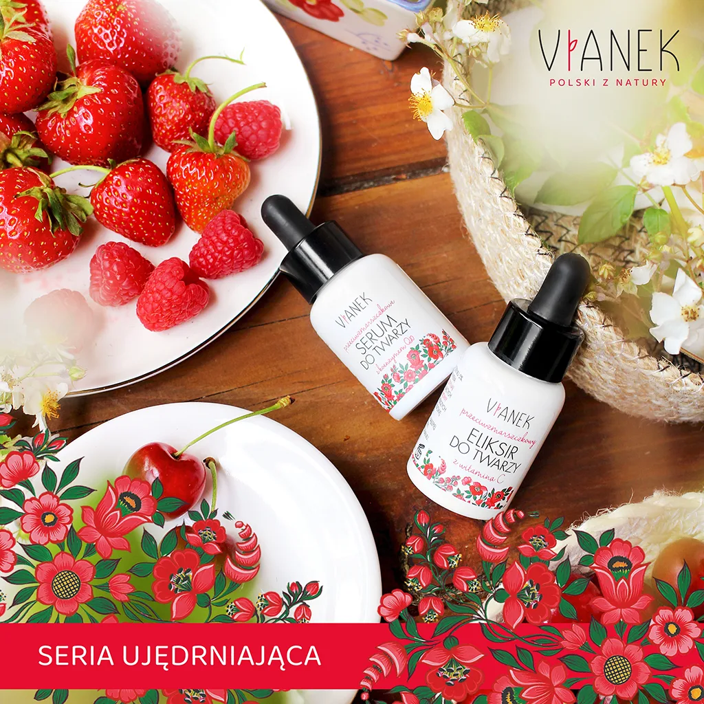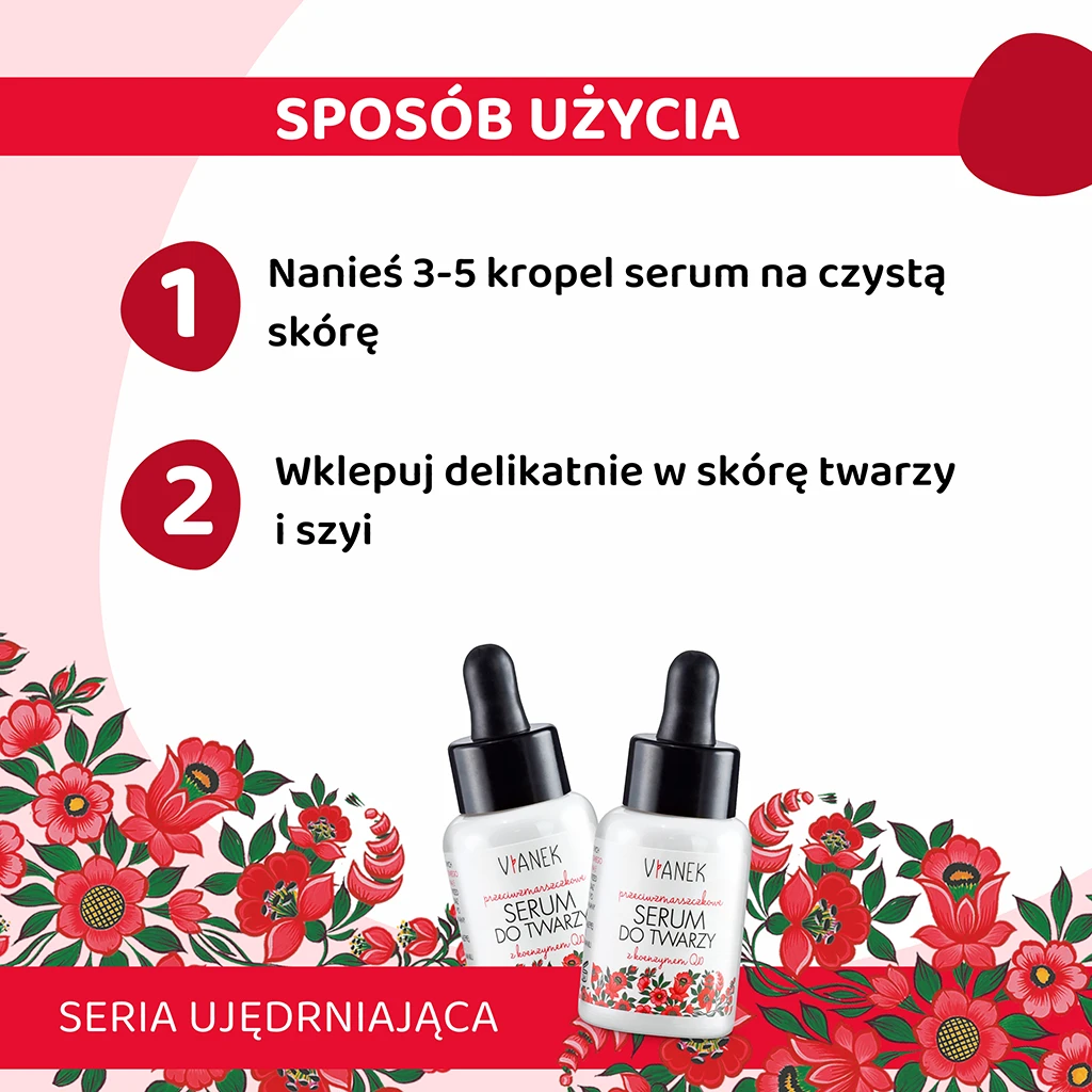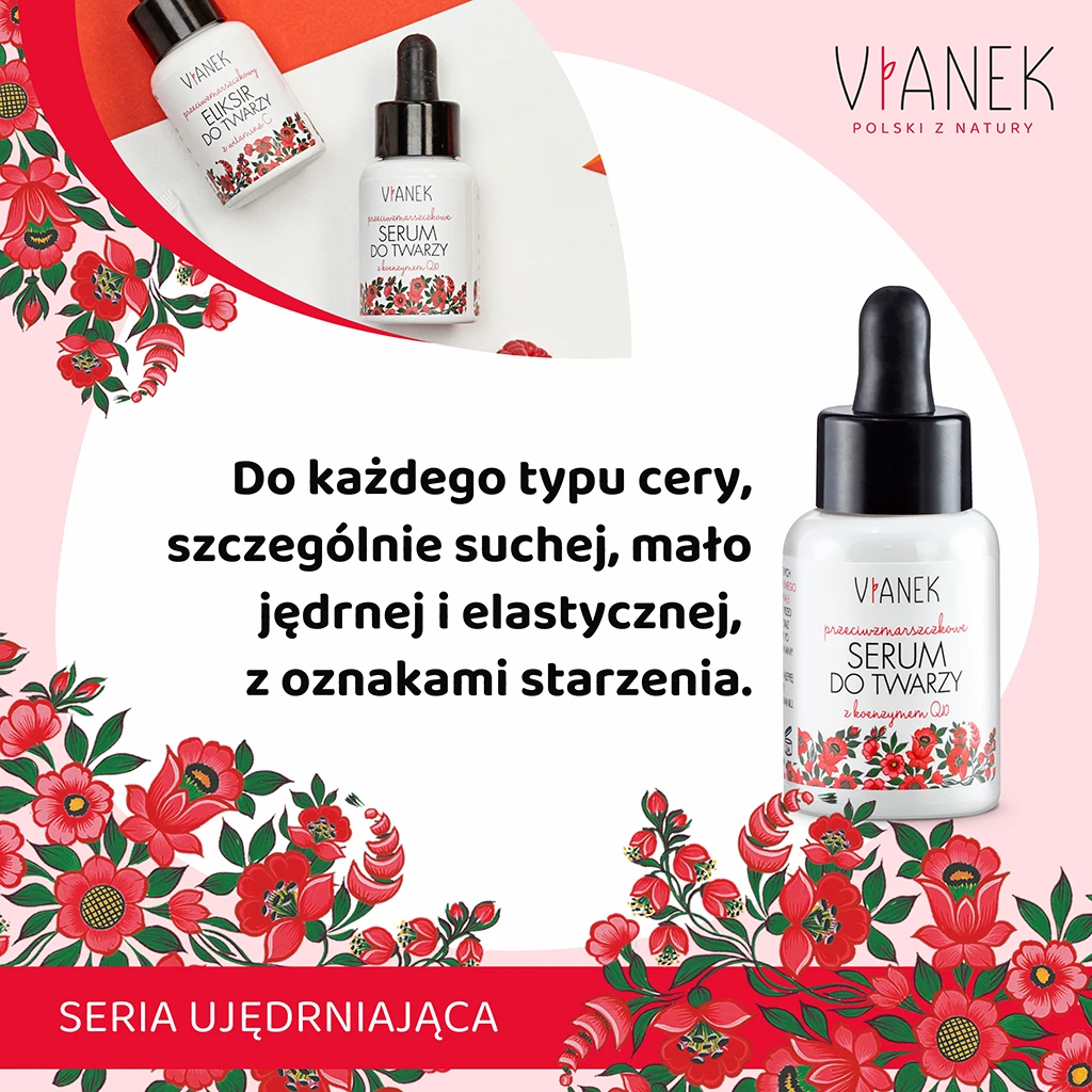 Odkryj tajemnicę zachowania dobrej kondycji skóry jak najdłużej z naszym przeciwzmarszczkowym serum do Twarzy VIANEK! Niezależnie od typu cery, nasz produkt jest stworzony dla Ciebie – szczególnie jeśli Twoja skóra jest sucha, brakuje jej jędrności i elastyczności, a pierwsze oznaki starzenia zaczynają być widoczne.