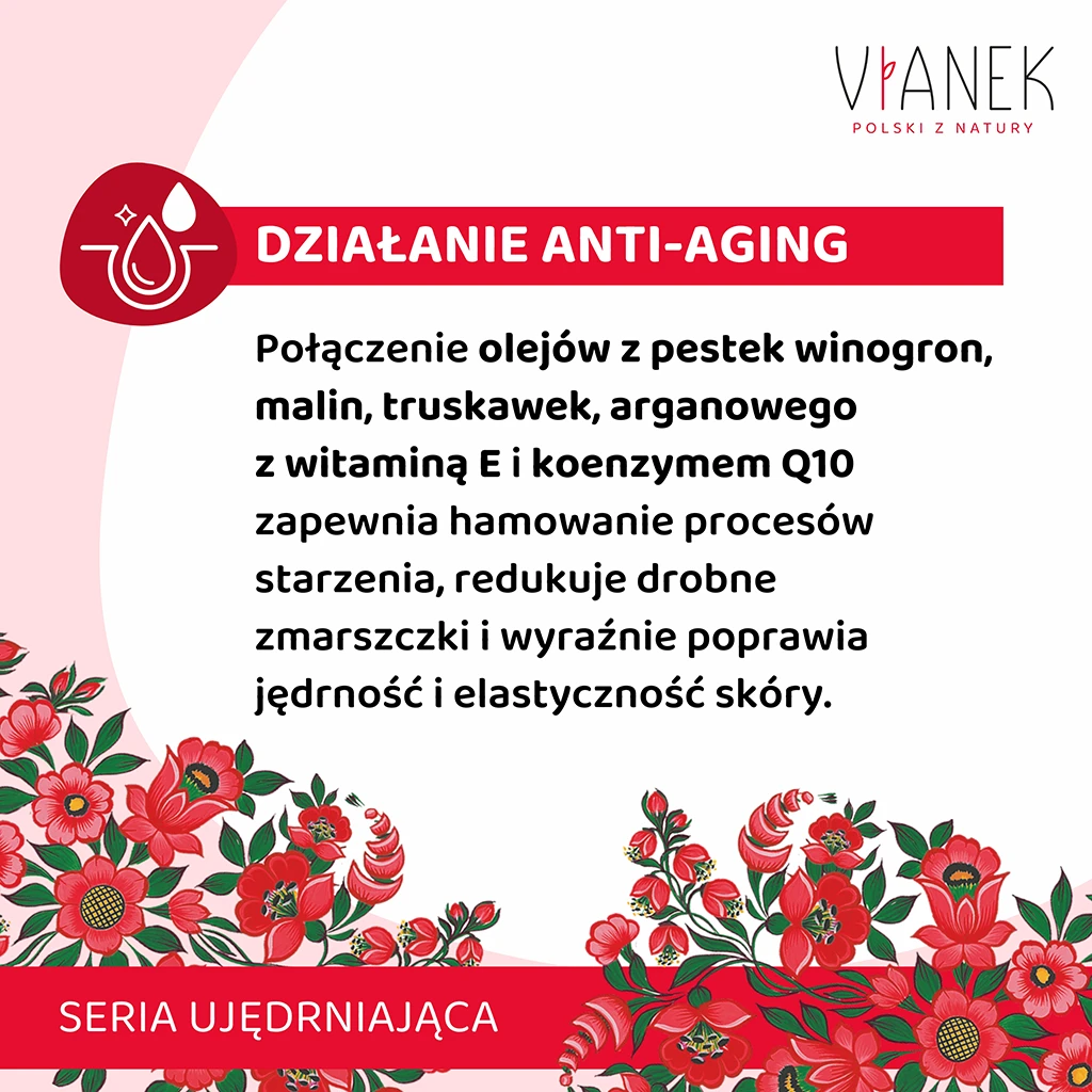 Działanie przeciwstarzeniowe? Oczywiście! Nasze serum to połączenie cennych olejów z pestek winogron, malin, truskawek oraz odżywczego oleju arganowego. Dodatkowo wzbogacone witaminą E i koenzymem Q10, zapewnia skuteczną obronę przed procesami starzenia, wygładza drobne zmarszczki, a co najważniejsze – rewitalizuje skórę, poprawiając jej jędrność oraz elastyczność.