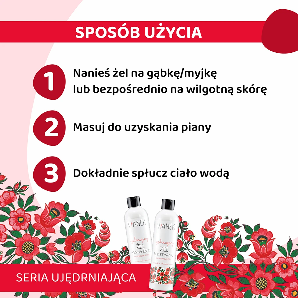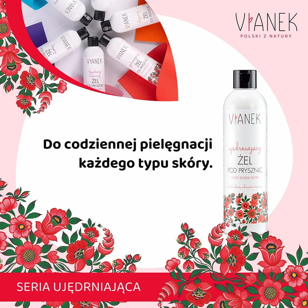 Przyjemność codziennej pielęgnacji staje się teraz nie tylko relaksem, ale także sposobem na wzmocnienie Twojej skóry dzięki VIANEK ujędrniającemu żelowi pod prysznic. To doskonały wybór dla wszystkich rodzajów skóry. Bez względu na to, czy Twoja cera jest wrażliwa, sucha czy normalna, ten żel przyniesie jej odpowiednią pielęgnację.
