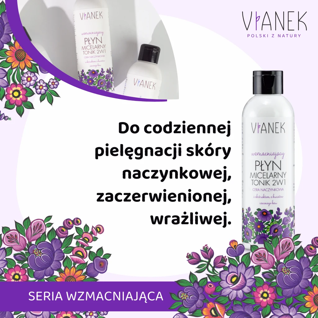 Płyn Micelarny i Tonik 2w1, stworzony z myślą o codziennej pielęgnacji cery naczynkowej, zaczerwienionej oraz wrażliwej. Produkt posiada delikatny, świeży aromat, który sprawi, że codzienny rytuał pielęgnacyjny stanie się znacznie przyjemniejszy.