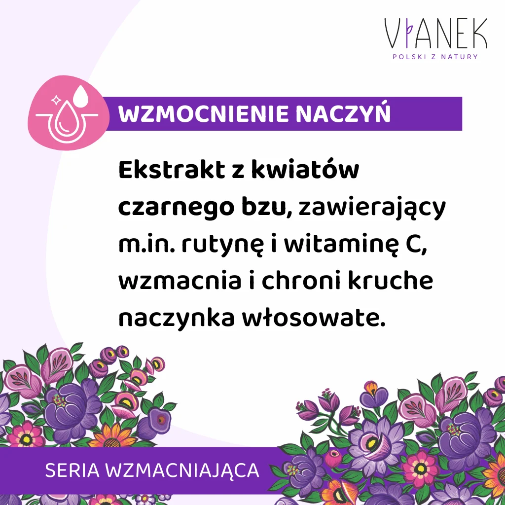 Płyn zawiera ekstrakt z kwiatów czarnego bzu, bogaty w rutynę i witaminę C. To naturalne wsparcie, które wzmacnia i chroni kruche naczynka włosowate, dodając cerze witalności i zdrowego blasku. Dodatek kwasu migdałowego pobudza komórki skóry do szybszej regeneracji, ujednolica koloryt i spłyca drobne zmarszczki, dzięki czemu cera staje się gładka i promienna.