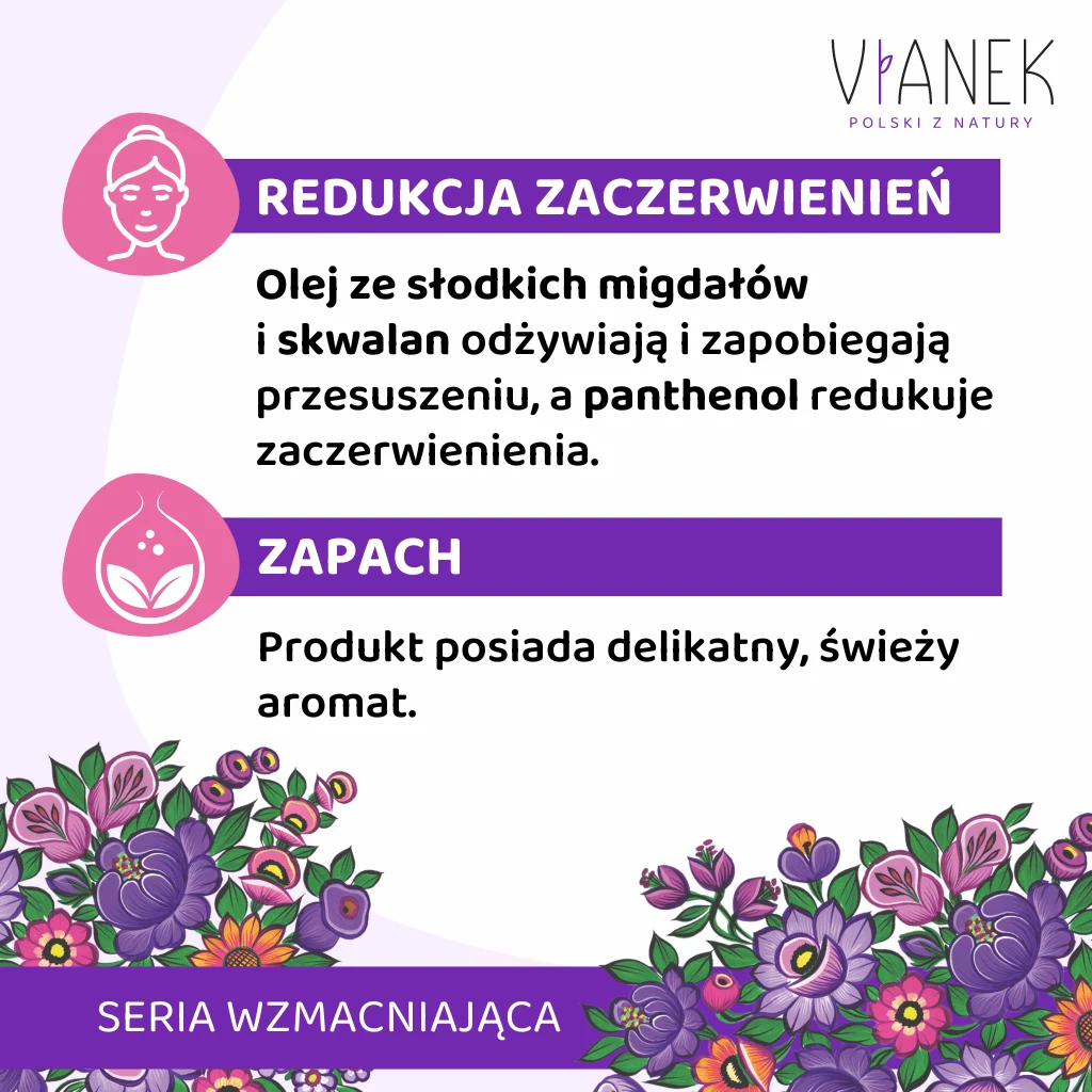 Twoja skóra potrzebuje odpowiedniego nawilżenia i odżywienia. Olej ze słodkich migdałów i skwalan to kompozycja, która odbuduje warstwę hydrolipidową cery, chroniąc ją przed przesuszeniem. Dodatkowo, panthenol skutecznie redukuje zaczerwienienia i koi podrażnienia, przywracając skórze naturalny koloryt.