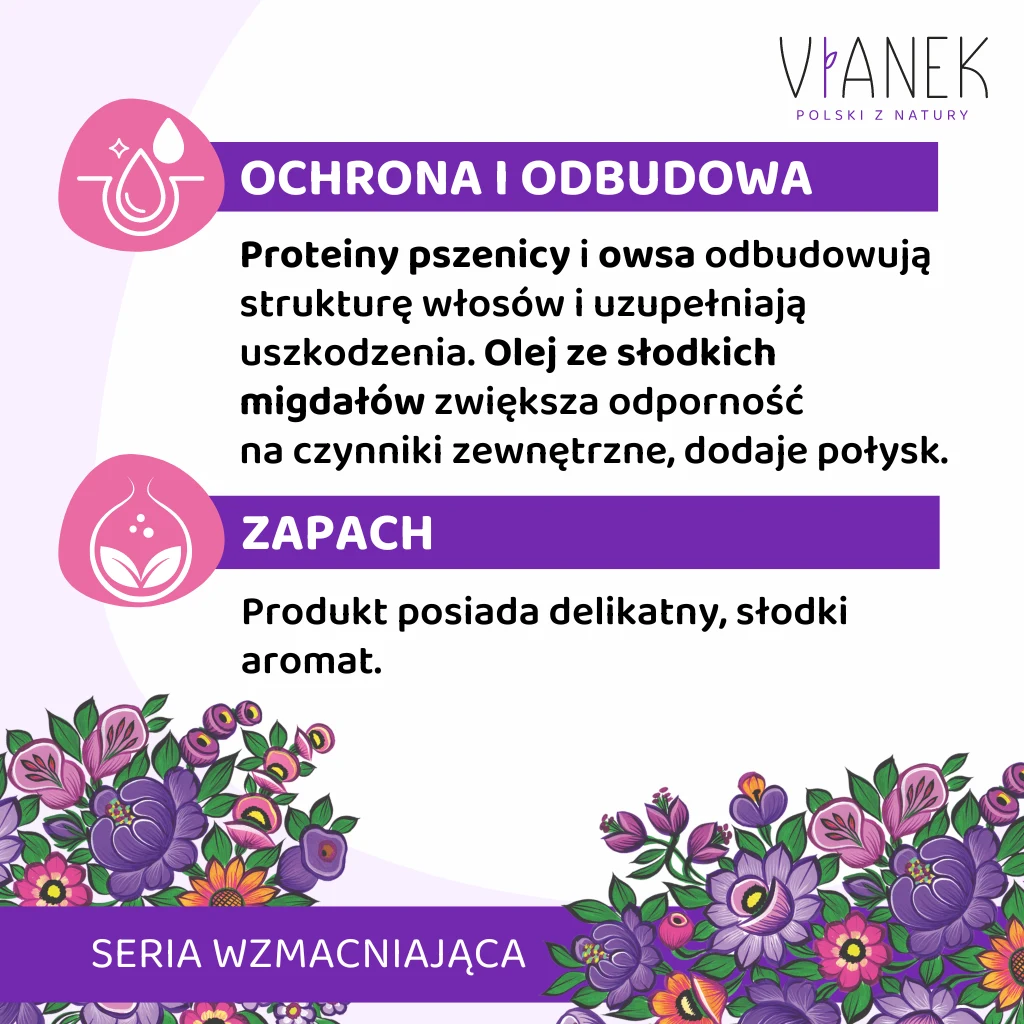 Delikatny szampon wzmacniający, opracowany z myślą o włosach suchych i zniszczonych. Zawiera nawilżający ekstrakt z aloesu oraz ekstrakt z nasion kozieradki, którego składniki aktywne wpływają na poprawę kondycji włosów i szybszy ich wzrost. Kompleks proteinowy (pszenica + owies) odbudowuje ich strukturę, zwiększając odporność kosmyków na szkodliwe czynniki zewnętrzne. Olej ze słodkich migdałów zmiękcza i odżywia, a panthenol, wykazując powinowactwo do keratyny, nadaje im objętości i je pogrubia.