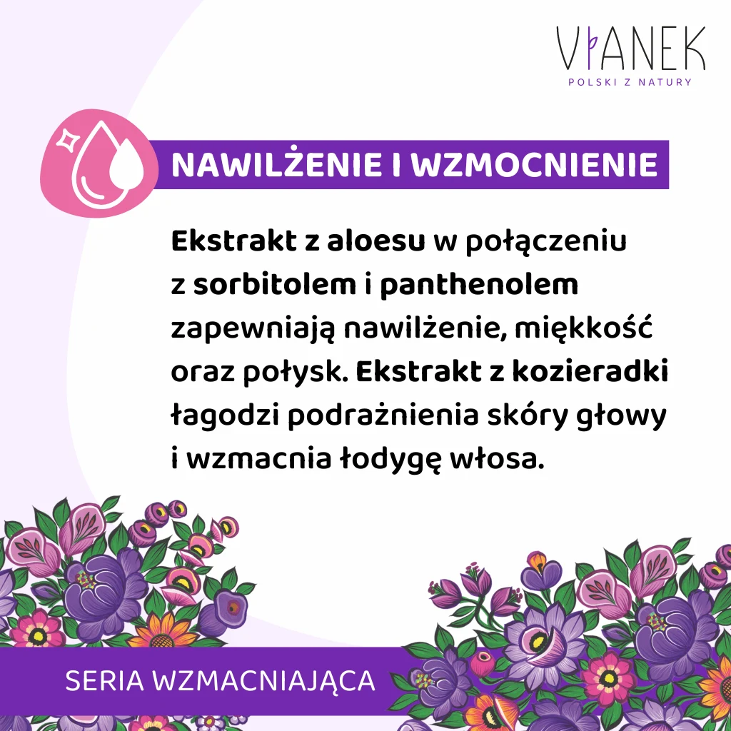 Jeśli Twoje włosy wymagają nawilżenia i wzmocnienia, to produkt idealny dla Ciebie. Ekstrakt z aloesu, w połączeniu z sorbitolem i panthenolem, zapewniają włosom głębokie nawilżenie, a także miękkość i niepowtarzalny blask. Ekstrakt z kozieradki natomiast łagodzi ewentualne podrażnienia skóry głowy i wzmacnia włosy od nasady po same końce.