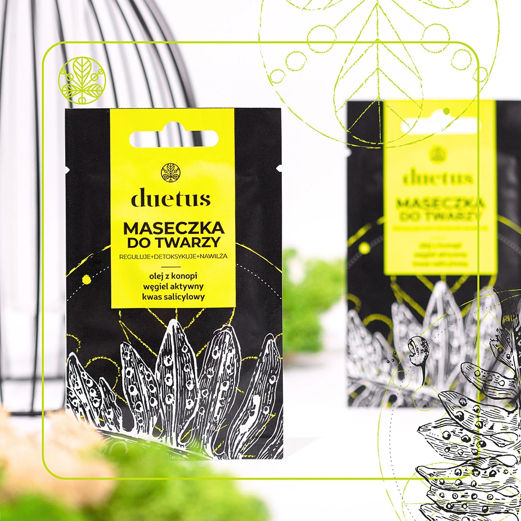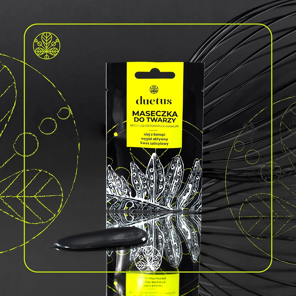 W zestawie znajduje się również maseczka Duetus, skoncentrowana na głębokim oczyszczeniu i regulacji wydzielania sebum. Kluczowe składniki takie jak kwas salicylowy, węgiel aktywny i olej konopny pomagają oczyścić pory, przyciągać i usuwać zanieczyszczenia oraz nadmiar sebum, co szczególnie przydaje się skórze tłustej i mieszanej. To idealny krok między pielęgnacją równoważącą a intensywnym oczyszczeniem.