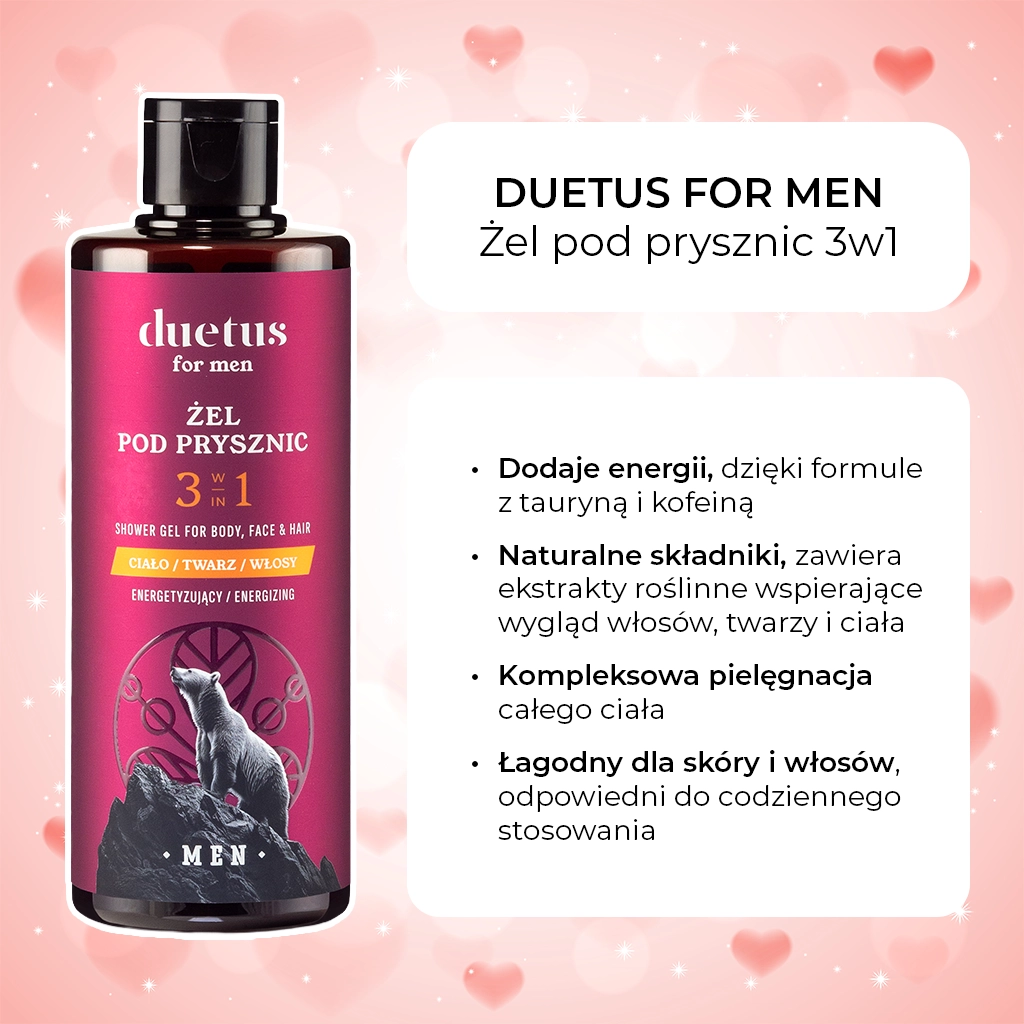 Energetyzujący żel pod prysznic Duetus for Men 3w1 w walentynkowym zestawie to praktyczny, ale pełen znaczenia gest — codzienna troska zamknięta w jednym kosmetyku. Skutecznie oczyszcza ciało, twarz i włosy, zapewniając długotrwałą świeżość i uczucie energii od samego rana. To idealny element prezentu, który pokazuje, że dbasz o komfort ukochanej osoby każdego dnia — nie tylko od święta. Prosty rytuał, który dodaje pewności siebie i dobrego samopoczucia, zawsze wtedy, gdy jest potrzebny.