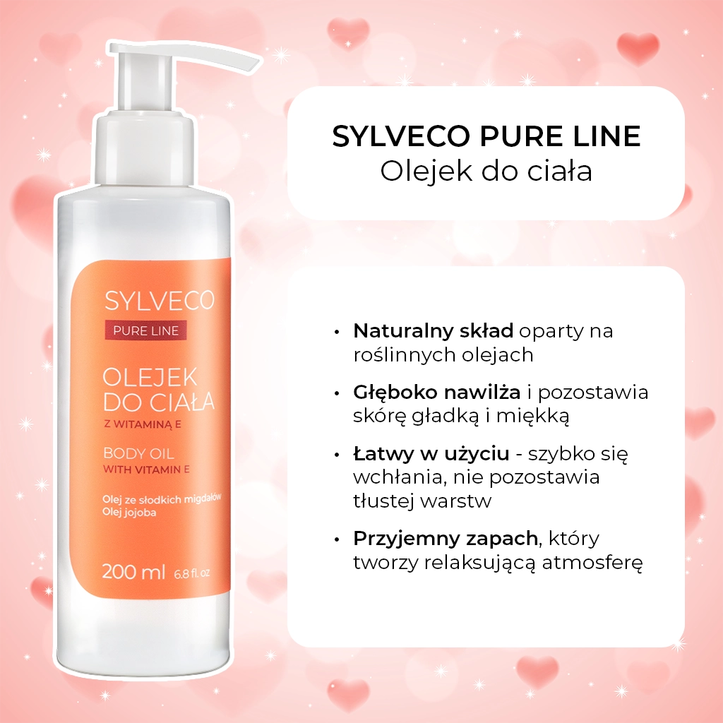 Olejek do ciała Sylveco Pure Line w walentynkowym zestawie to zaproszenie do chwil czułości i bliskości, które zaczynają się od świadomego dotyku. Naturalna, bogata formuła intensywnie nawilża i odżywia skórę, pozostawiając ją miękką, gładką i elastyczną — idealną do masażu i wspólnych, spokojnych wieczorów. Delikatny zapach i lekka konsystencja sprawiają, że pielęgnacja zamienia się w zmysłowy rytuał, który buduje intymność i pozwala powiedzieć „jestem tu dla Ciebie” bez użycia słów.