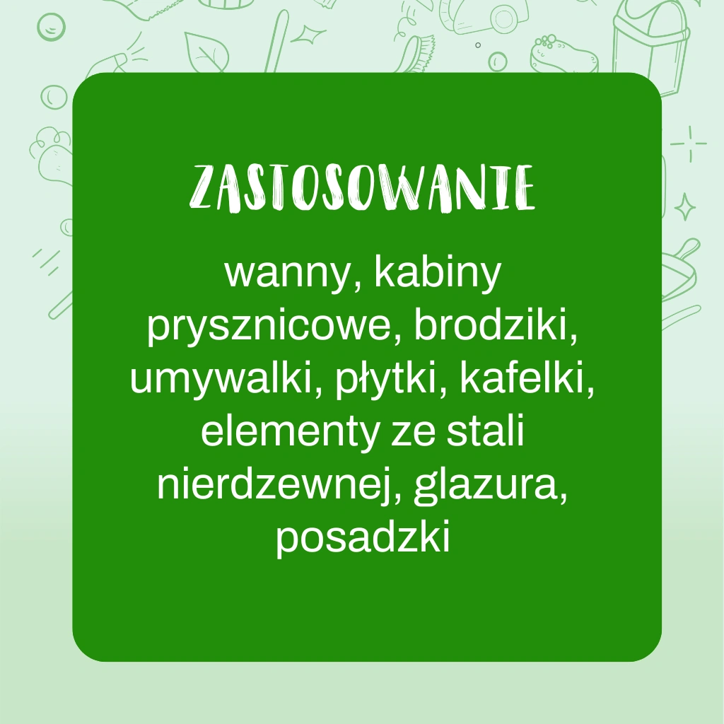 Naturalny płyn skutecznie usuwa łazienkowe zabrudzenia i osady z armatury, kabin prysznicowych, płytek oraz innych powierzchni. Szybko, bez smug i zacieków. Wystarczy spryskać preparatem czyszczoną powierzchnię i po kilku chwilach przetrzeć czystym ręcznikiem.