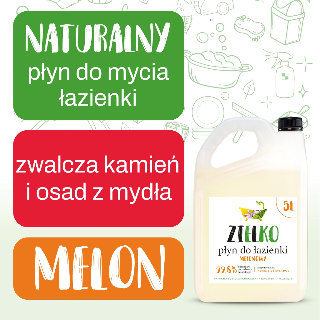Koniec z ostrymi, chemicznymi zapachami! Płyn do łazienki ZIELKO urzeka delikatnym aromatem melona, który pozostawia w pomieszczeniu przyjemną, długo utrzymującą się świeżość i czystość.