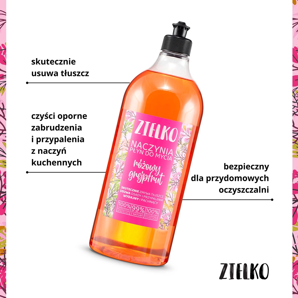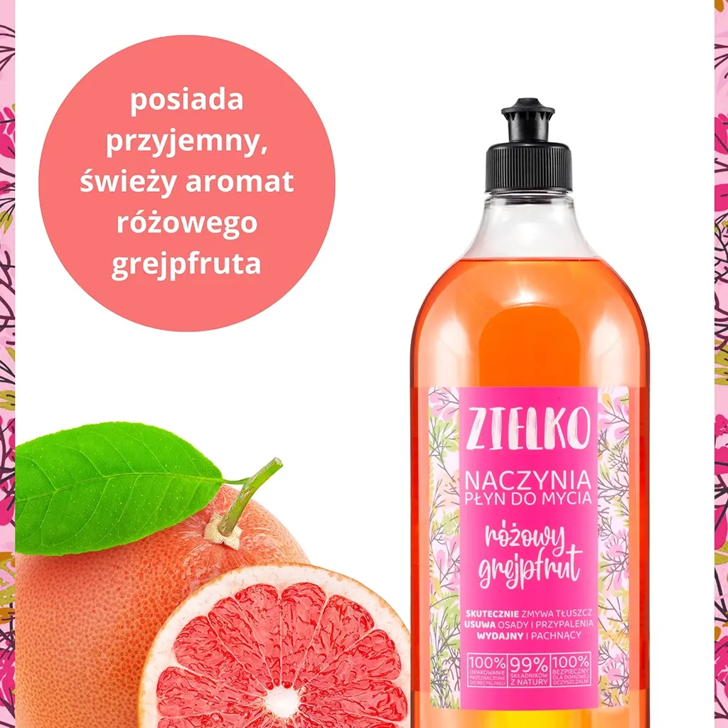 Płyn zachwyca swoim świeżym i apetycznym aromatem różowego grejpfruta, który na długo utrzymuje się w kuchni, przynosząc uczucie czystości i odświeżenia. Mycie naczyń z użyciem naturalnego płynu ZIELKO sprawia, że codzienne obowiązki stają się znacznie przyjemniejsze.