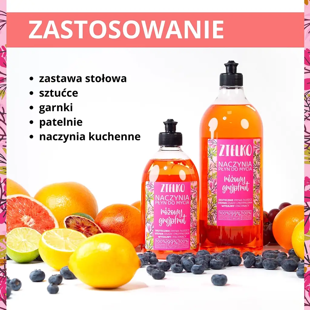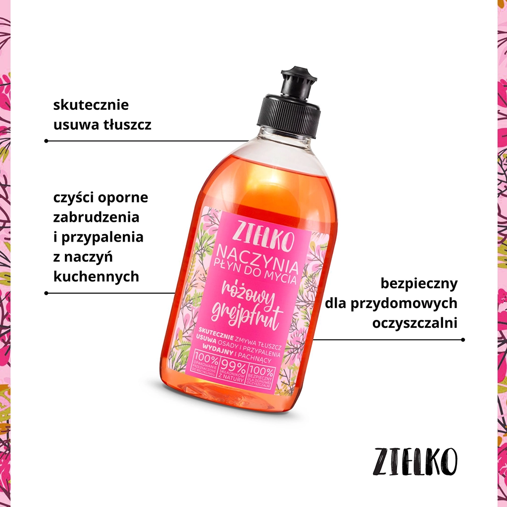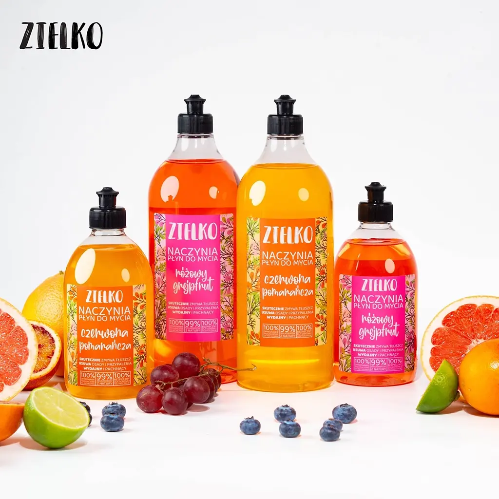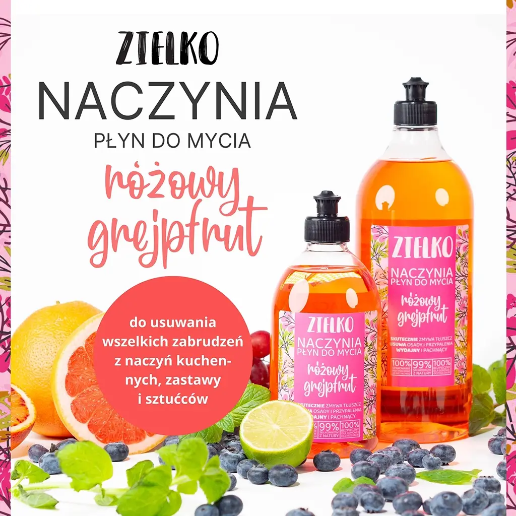 Płyn zachwyca swoim świeżym i apetycznym aromatem różowego grejpfruta, który na długo utrzymuje się w kuchni, przynosząc uczucie czystości i odświeżenia. Mycie naczyń z użyciem naturalnego płynu ZIELKO sprawia, że codzienne obowiązki stają się znacznie przyjemniejsze.