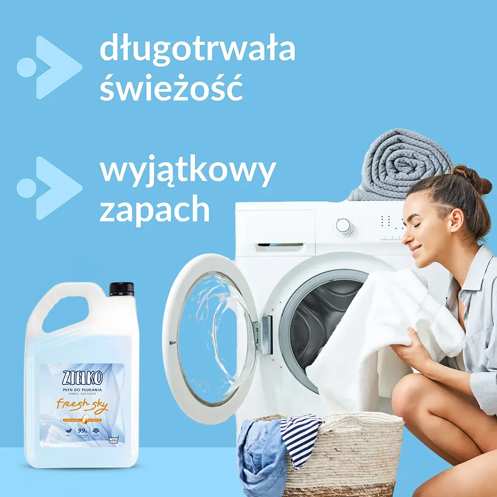 Poczuj orzeźwiający powiew świeżości! ZIELKO Płyn do płukania FRESH SKY otula ubrania lekkim, chłodnym aromatem inspirowanym morską bryzą i czystością natury. Jego formuła zmiękcza tkaniny, wygładzając ich strukturę i chroniąc włókna przed zniszczeniem. Idealny do codziennego użytku, zapewnia długotrwałą świeżość i subtelny, niebiański zapach.