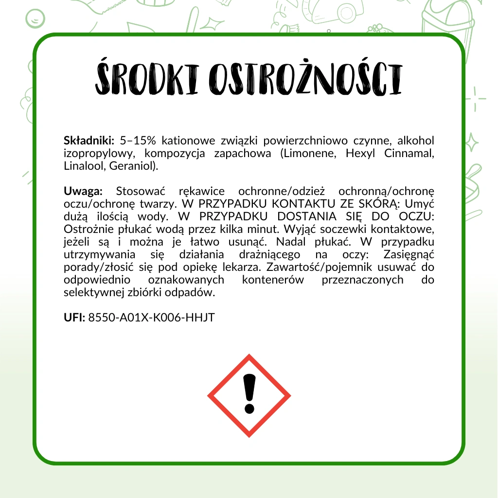 Uwaga: Stosować rękawice ochronne / odzież ochronną / ochronę oczu / ochronę twarzy. W PRZYPADKU KONTAKTU ZE SKÓRĄ: Umyć dużą ilością wody. W PRZYPADKU DOSTANIA SIĘ DO OCZU: Ostrożnie płukać wodą przez kilka minut. Wyjąć soczewki kontaktowe, jeżeli chcą i można je łatwo usunąć. Nadal płukać. W przypadku utrzymywania się działania drażniącego na oczy: zasięgnąć porady / zgłosić się pod opiekę lekarza. Zawartość / pojemnik usuwać do odpowiednio oznakowanych kontenerów przeznaczonych do selektywnej zbiórki odpadów.