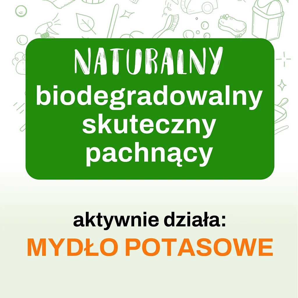 Dzięki zawartości szarego mydła, czyli mydła potasowego, nasz płyn idealnie zastępuje tradycyjne środki czystości. Skutecznie usuwa tłuszcz, brud oraz doskonale radzi sobie z trudnymi plamami.