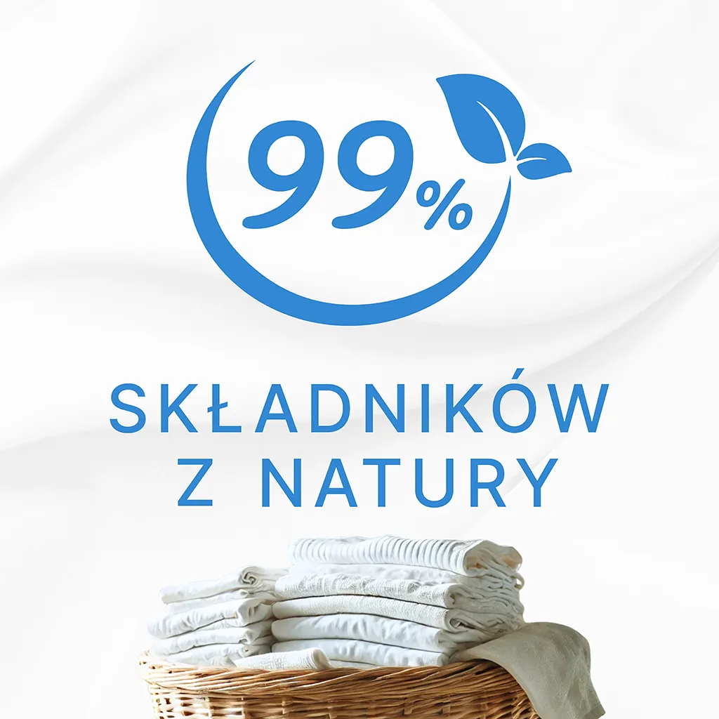 Subtelny, naturalny zapach otula ubrania, dając uczucie świeżości i nieskazitelnej czystości. Płyn działa aktywnie już w niskich temperaturach (20-40°C), oszczędzając energię i chroniąc delikatne włókna.