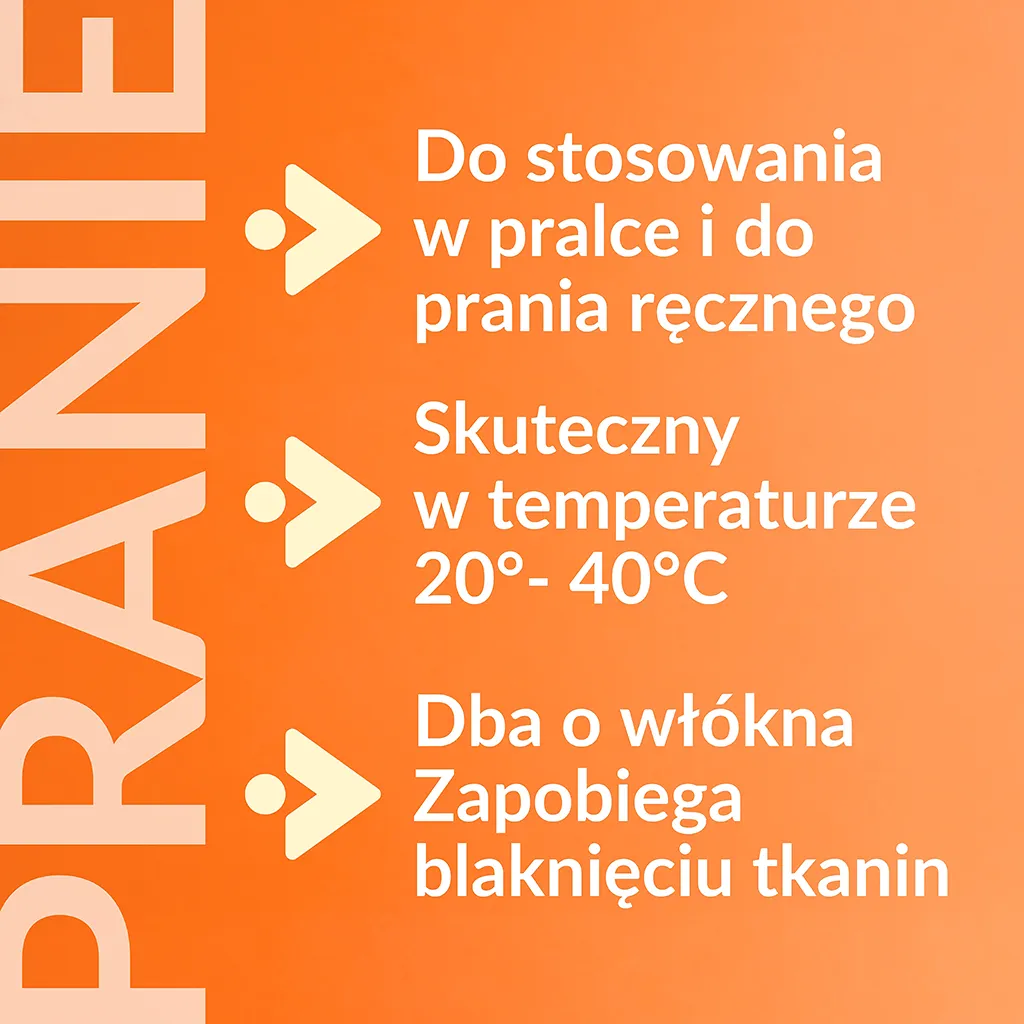 Do stosowania zarówno podczas prania ręcznego oraz w pralce, skuteczny w temperaturze 20°- 40°C.