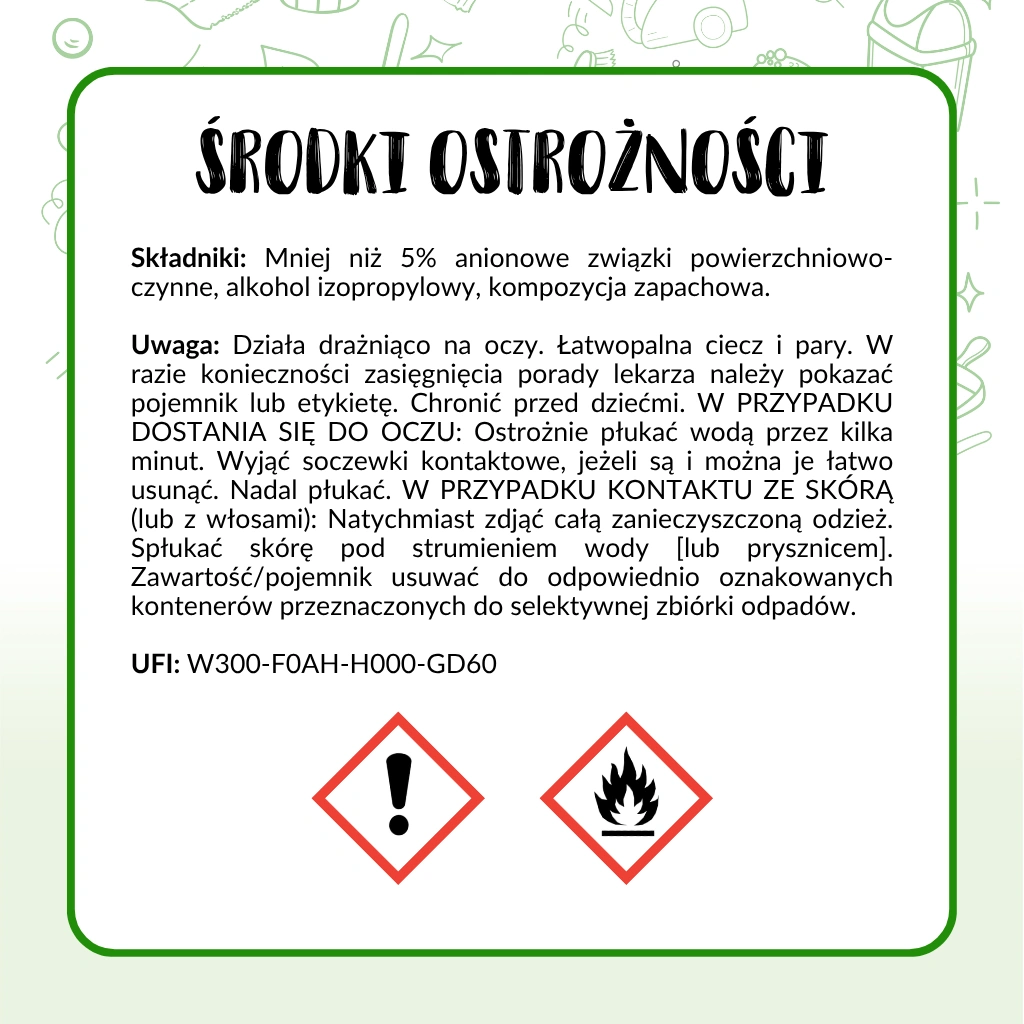 Składniki: Mniej niż 5% anionowe związki powierzchniowo czynne, alkohol izopropylowy, kompozycja zapachowa.