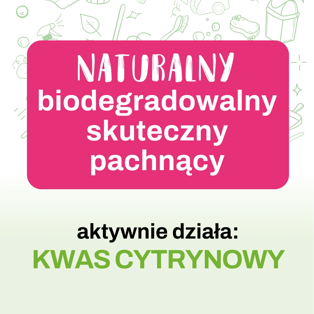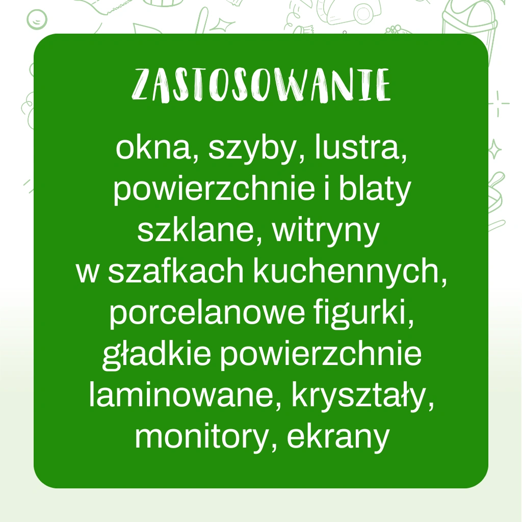 pH: 3.19 Aktywnie działa: kwas cytrynowy.Zastosowanie: okna, szyby, lustra, powierzchnie i blaty szklane, naczynia ze szkła, witryny w szafkach kuchennych, porcelanowe figurki, gładkie powierzchnie laminowane, kryształy, monitory/ ekrany(należy płyn nanieść na materiał i lekko wilgotnym czyścić powierzchnię)