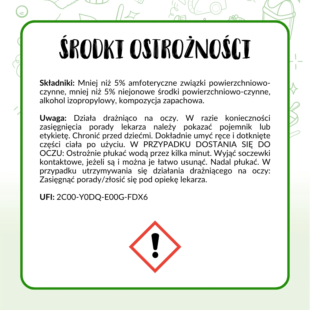 Składniki: Mniej niż 5% amfoteryczne związki powierzchniowo czynne, mniej niż 5% niejonowe środki powierzchniowo czynne, alkohol izopropylowy, kompozycja zapachowa.