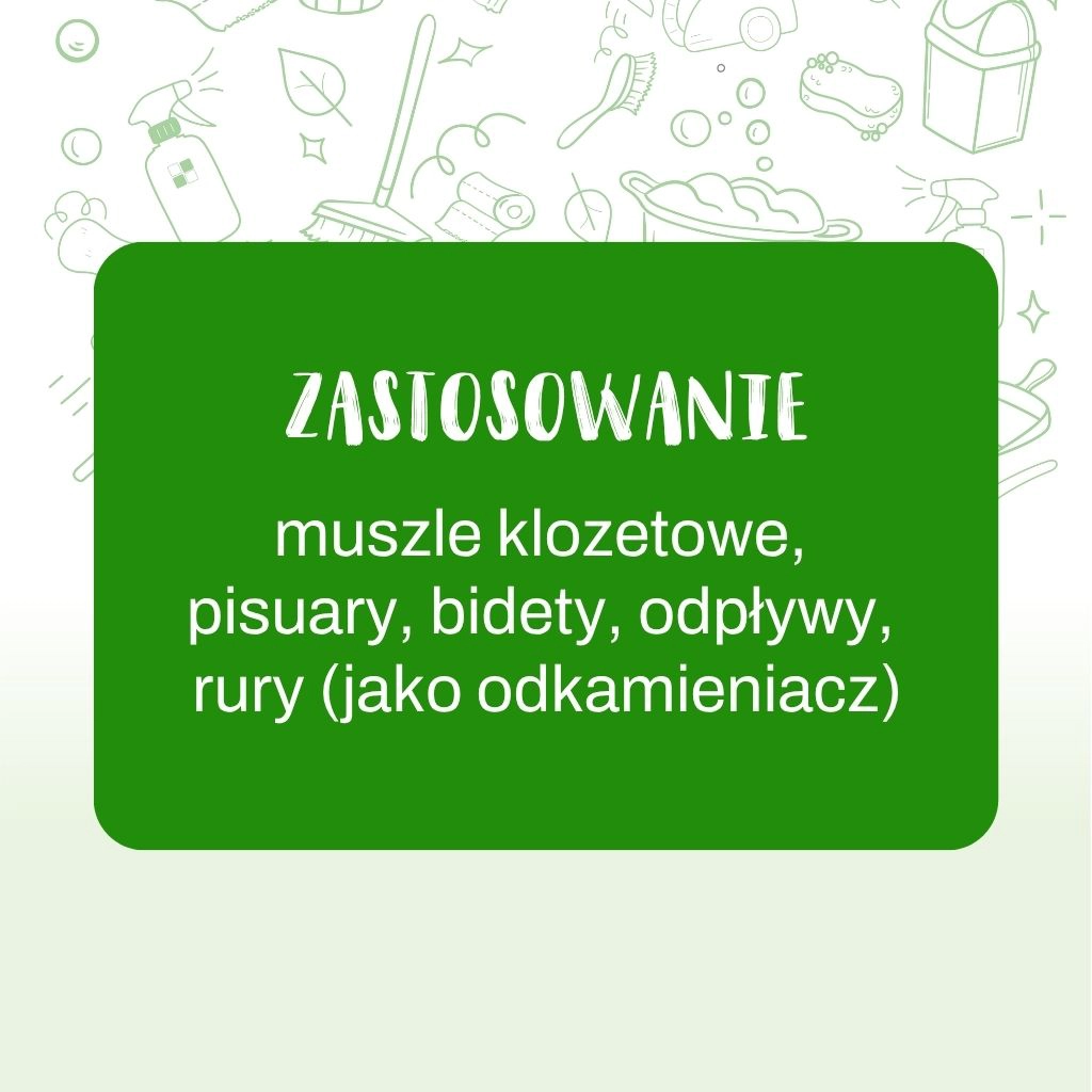 Nanieść produkt pod krawędź muszli, a po chwili spłukać wodą. Przy silniejszych zabrudzeniach żel pozostawić na noc, a następnie wyszorować szczotką.